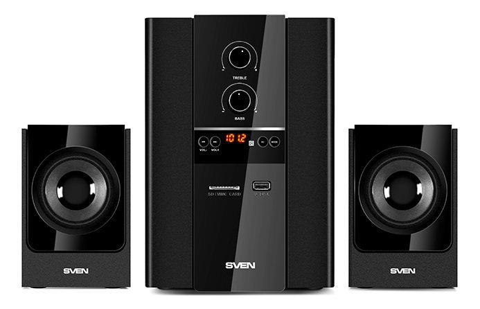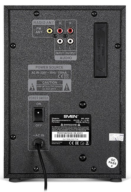 На передней панели сабвуфера расположены регуляторы громкости системы и сабвуфера, кнопка переключения режимов, разъемы для подключения USB flash и SD/MMC карт памяти, LED-дисплей. С помощью цифрового дисплея отслеживается частота выбранной радиостанции, а также отображается активированный режим работы системы (AUX, FM или MP3). Управлять акустикой SVEN MS-1820 можно также с помощью пульта дистанционного управления. Модель очень компактна и способна встроиться в загроможденное, например, лампой или принтером, рабочее пространство на столе. Конструкция сабвуфера выполнена по технологии Band-pass, которая позволяет добиться более глубокого и насыщенного баса. Дизайн модели ультрасовременный. Сияющий глянец и приглушенный блеск матовой поверхности корпуса системы гармонично сочетаются друг с другом. Смелый союз разных по текстуре материалов усиливает впечатление контраста и подчеркивает основную идею разработчиков: SVEN MS-1820 – это классика в современном исполнении.