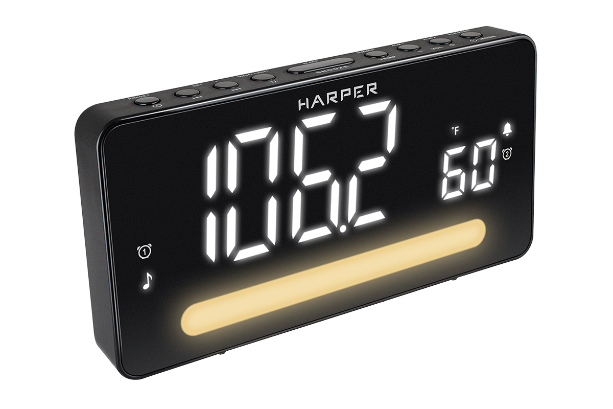 Радиочасы с будильником Harper HCLK-5030 обеспечит вам не только комфортный подъём под музыкальное сопровождение любимой радиостанции, но и предоставит вам ряд полезных функций: встроенный комнатный термометр, регулируемый LED светильник, который может работать как ночник, крупные светодиодные цифры белого цвета для отображения времени, два независимых будильника и экран с диагональю 1,8 дюйма. Плюс, радиобудильник Harper HCLK-5030 сохраняют до 10 станций AM и до 10 станций FM-диапазона. На случай отключения сети можно установить батареи AAA, они будут использоваться для сохранения настроек.