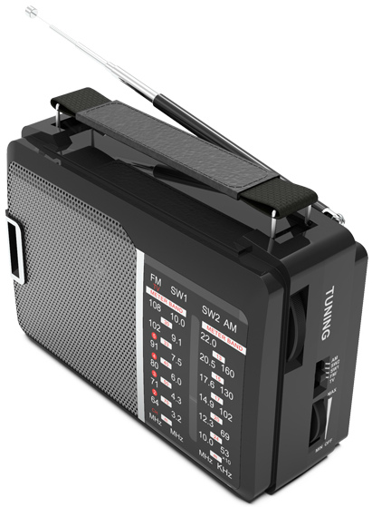 Радиоприёмник в небольшом корпусе отличает шкала с крупными цифрами радиочастот, удобные колесики настройки волны радиоприёма и настройки громкости комфортно расположены на боковой поверхности. Благодаря качественной телескопической антенне, поворотной на 360 градусов, отлично принимает радиосигнал на диапазонах FM, AM, SW1 и SW2. Может работать от электросети (кабель питания от 220В в комплекте, за съёмной крышкой на задней поверхности приёмника). Также может использоваться портативно – работает от батареек типа D («бочонков»). Батарейки в комплект не включены из-за ограниченности их срока хранения, рекомендуем приобрести 2шт самой «свежей» даты изготовления непосредственно перед использованием. Радиоприёмник имеет удобную ручку для переноски.