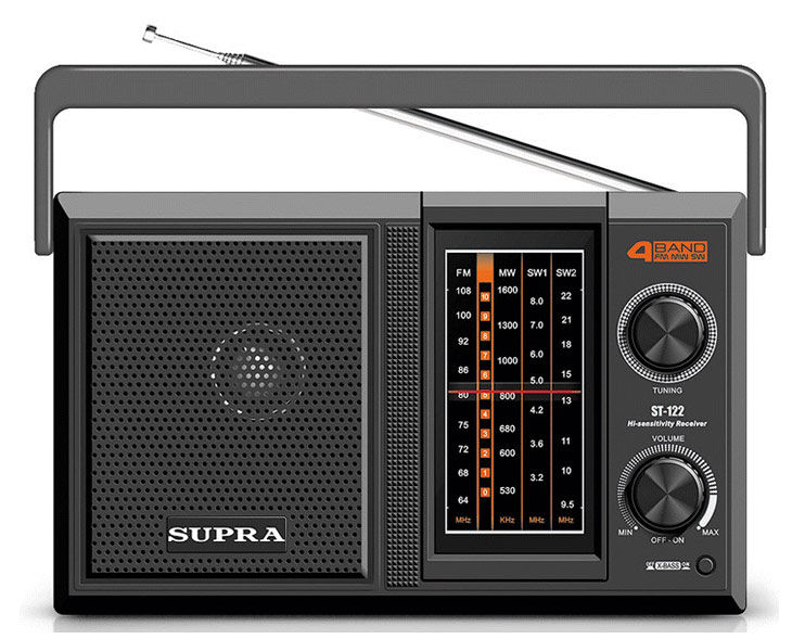 Классический дизайн радиоприемника SUPRA ST-122 станет отличным украшением интерьера, а его возможность поддерживать широкий диапазон радиоволн от FM и FM до SW сделает прослушивания ваших любимых радиостанций удобным и приятным процессом. Аналоговый тип тюнера удобен в выборе нужной радиостанции с помощью бегунка по разметке на экране корпуса. Портативный радиоприемник данной модели станет вашим спутником в поездках на природу, на дачу. Питание возможно как от сети, так и от аккумуляторов, поэтому при необходимости устройство не зависит от проводов и розеток. Радиоприемник SUPRA ST-122 оборудован достаточно мощным внешним динамиком, который способен работать с производительностью 1000 мВт. Для удобства переноски данное устройство оснащено комфортной складной рукояткой.