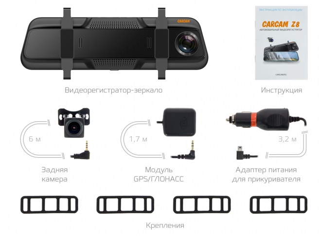 CARCAM Z8 — автомобильный двухкамерный Quad HD видеорегистратор, оснащенный внешним GPS-модулем. Устройство выполнено в корпусе накладки на зеркало заднего вида. Универсальные эластичные крепления позволяют установить видеорегистратор в большинстве современных автомобилей. Основная камера регистратора ведёт съемку в разрешении 2560×1440p и обладает углом обзора 150°. Дополнительная камера с углом обзора 130° записывает видео в разрешении 1920×1080p. Для максимально удобного использования режима парковочной камеры и просмотра записанных видео устройство оснащено большим сенсорным LCD-дисплеем с диагональю 9.66″.