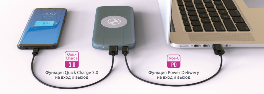 Благодаря технологии Power Delivery внешний аккумулятор QW-10 может передавать через разъем Type-C ток с максимальной выходной мощностью 18 Ватт. Это вдвое больше того, что могут предложить другие подобные устройства. QW-10 полностью соответствует требованиям мощных современных смартфонов и даже некоторых ноутбуков.