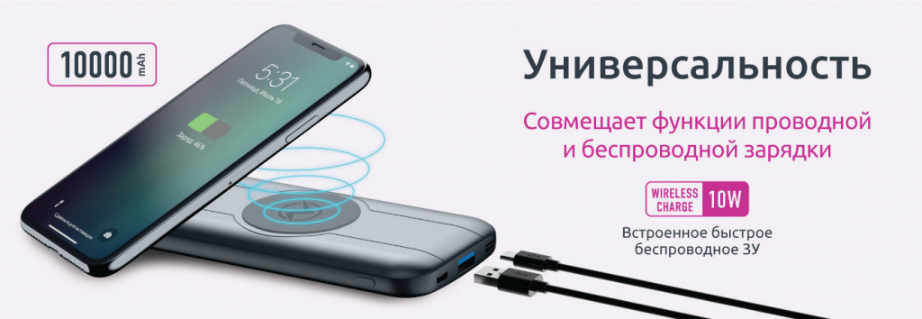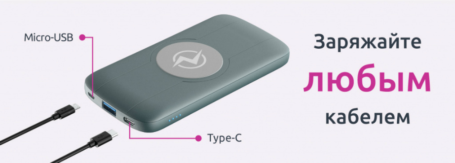 На корпусе повер банка контактная силиконовая площадка, с которой смартфон не будет соскальзывать, поэтому Вы можете просто положить смартфон сверху на внешний аккумулятор и зарядка начнется автоматически. Также можно использовать и обычный способ зарядки, через подключение к USB-порту.