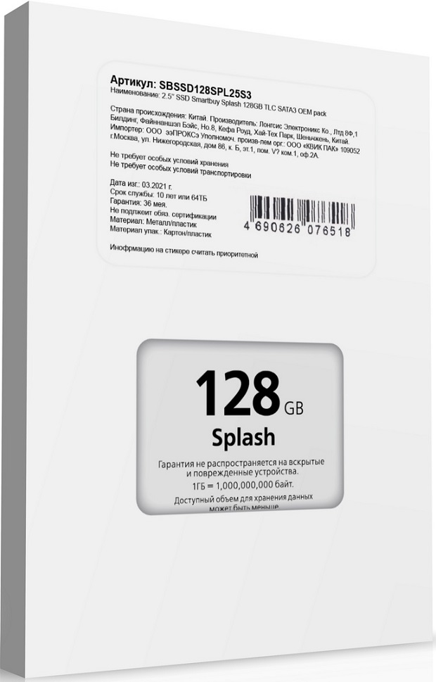 SSD Накопитель SmartBuy Splash 128GB OEM pack SBSSD128SPL25S3 2,5" TLC SATA3