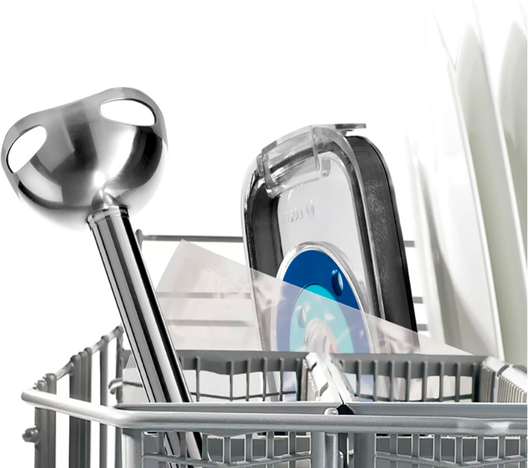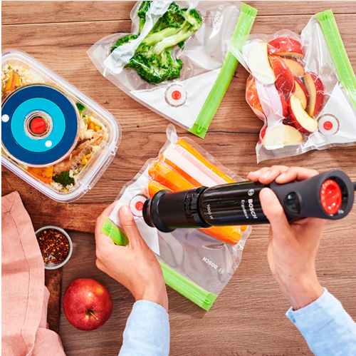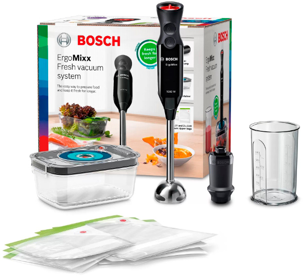 Блендер Bosch MS6CB61V1 укомплектован системой вакуумирования свежих продуктов: насос, прочный контейнер с крышкой и пластиковые пакеты. Насадка-насос присоединяется к ручному блендеру благодаря механизму Click, запатентованному компанией Бош. Высокой мощности моторного 1000 Вт блока достаточно и для измельчения, и для откачивания воздуха. 12 стандартных скоростных режимов дополнены режимом «турбо».