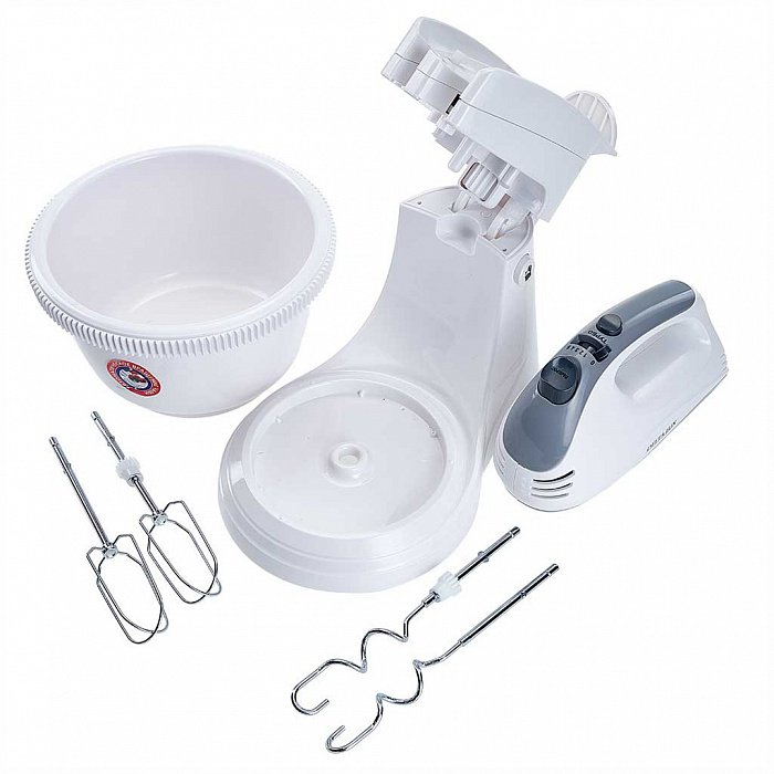 Особенности Подставка с откидным механизмом. 2 венчика для взбивания яиц и крема. 2 насадки для замешивания тяжелого теста. Кнопка извлечения насадок. Резиновые противоскользящие ножки. 2 режима работы: ручной и стационарный. 5 скоростных режимов. Режим «ТУРБО» .