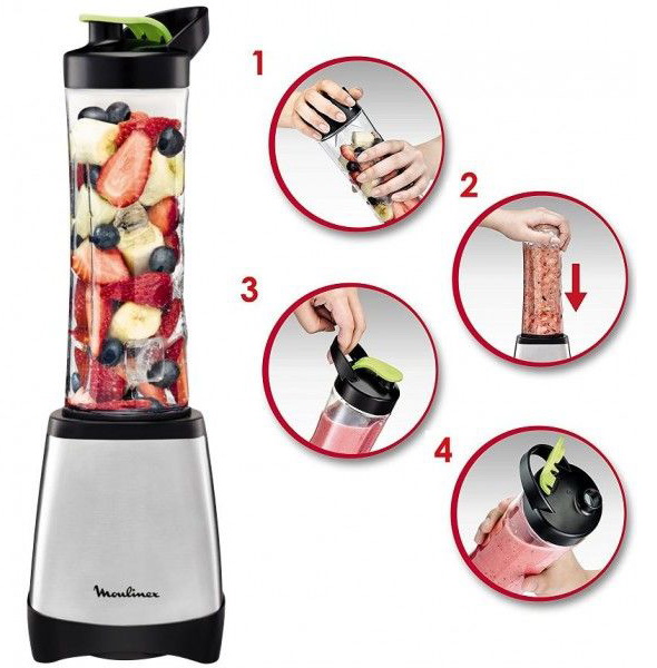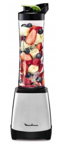 Стационарный блендер MOULINEX LM1A0D10, работающий от электросети, очень прост и удобен в использовании. Он выполнен в корпусе из нержавеющей стали и оснащен пластиковой чашей для смешивания объемом 0,7 л. Прибор с мощностью 300 Вт поддерживает 1 скорость работы. Он способен быстро и качественно смешивать ингредиенты. В комплект входит насадка-измельчитель, с помощью которой можно измельчать твердые продукты, такие как орехи, шоколад. Блендер MOULINEX LM1A0D10 идеально подходит для приготовления детского питания, жидкого теста, различных соусов, коктейлей и смузи. Удобная бутылка с крышкой позволяет брать приготовленный напиток с собой в дорогу. На крышке имеется отверстие для питья, которое закрывается колпачком, и ручка для транспортировки.