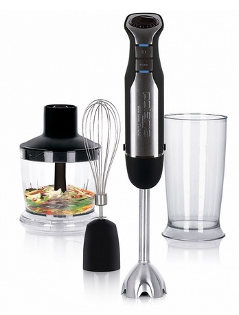 POLARIS PHB 1043 A - погружной блендер с металличнской рабочей частью, мягким прорезиненным покрытием и двумя скоростными режимами работы. Оснащен измельчителем объемом 500 мл, насадкой-венчиком и мерным стаканом. Предусмотрены также "турбо"-режим работы и плавная регулировка скоростных режимов