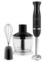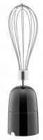 Блендер укомплектован мини-измельчителем на 0.6 л и венчиком для взбивания, с котрым вы быстро и с комфортом сможете замесить тесто, а также взбить белки или сливки. Прибор выполнен в классическом дизайне из черного пластика, подчеркнутом хромированной декорацией.
