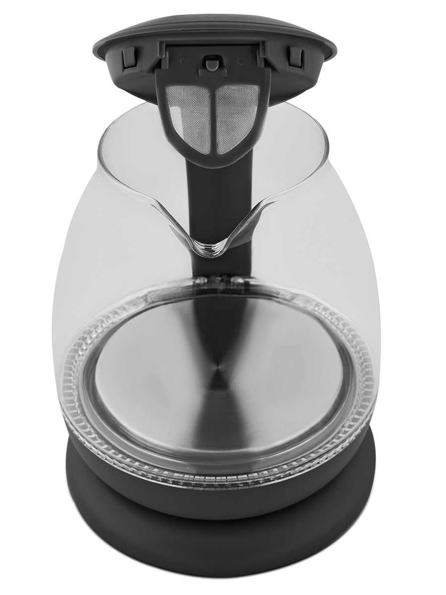 Электрический чайник в корпусе из жаропрочного стекла с BLUE LED-подсветкой рабочего режима, закрытым нагревательным элементом, шкалой уровня воды и защитным автоотключением после закипания или при недостаточном уровне воды.