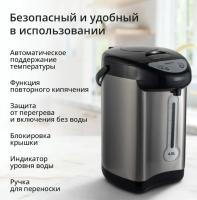 Элегантный черно-серебристый дизайн термопота гармонично впишется в любой интерьер, придавая ему современный и стильный вид. Устройство работает тихо и эффективно, что делает его идеальным выбором для повседневного использования. С этим термопотом вы всегда будете уверены, что горячая вода будет под рукой в нужный момент, будь то утренний кофе, чай в обеденный перерыв или приготовление пищи.