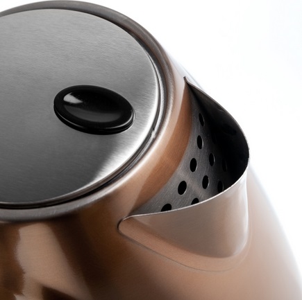 Электрический чайник в корпусе из окрашенной нержавеющей стали с закрытым нагревательным элементом, открытием крышки нажатием на кнопку и защитным автоотключением после закипания и при перегреве.