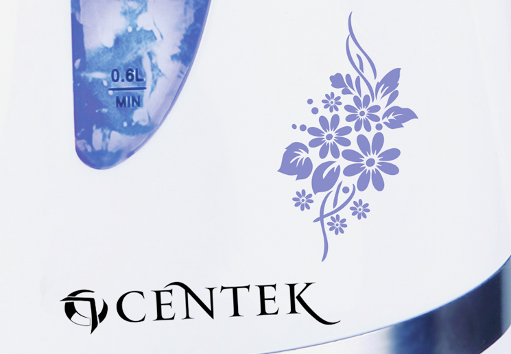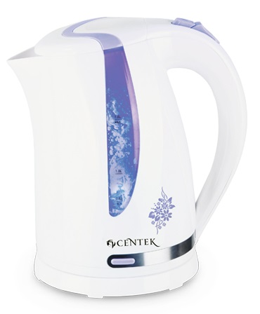 Чайник CENTEK CT-0040 в корпусе из термостойкого пластика, оснащен внутренней подсветкой , закрытым нагревательным элементом, съемным фильтром от накипи и центральным подключением к подставке.