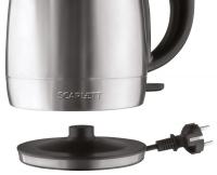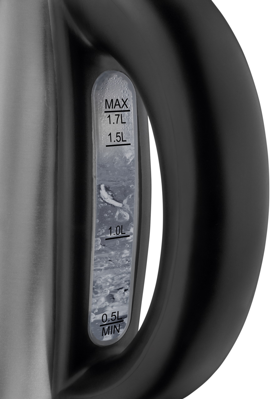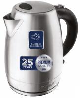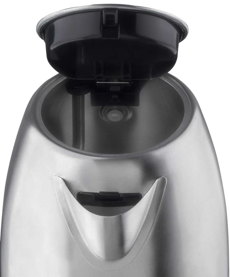 Электрический чайник объемом 1,7 л и мощностью макс 2200 Вт оснащён закрытым нагревательным элементом, автоматическим открытием крышки, и съемным фильтром для защиты от накипи. Корпус прибора выполнен целиком из высококачественной нержавеющей стали. Удобная мерная шкала под ручкой позволит контролировать уровень воды.