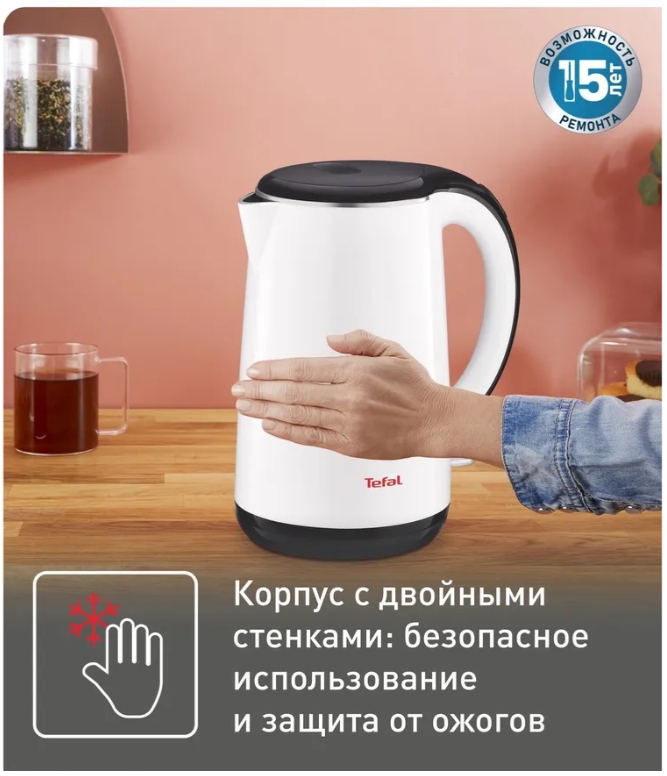 Благодаря двойным стенкам корпуса чайник не перегревается, и до него спокойно можно дотронуться рукой, не боясь обжечься