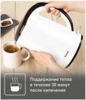 Функциональный и стильный электрочайник Tefal KO2601 белого цвета обладает довольно высокой мощностью (2150 Вт). Вода в нем закипает за считанные минуты и может долго оставаться горячей благодаря особенностям конструкции. В чайнике предусмотрена внутренняя колба из нержавеющей стали, заключенная в корпус из пластика, что обеспечивает «эффект термоса». При этом конструкция чайника довольно эргономичная, что делает его повседневное использование очень комфортным. Есть шкала уровня воды, чтобы точно заполнять чайник при необходимости.
