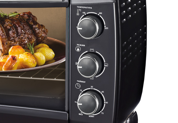 Электрическая печь CENTEK CT-1532 в корпусе черного цвета с эмалью легкой очистки оснащена регулятором температуры до 320 градусов, тремя режимами работы и таймером. Предусмотрен звуковой сигнал окончания работы. В комплекте жарочная решетка, стальной эмалированный противень, крюк.