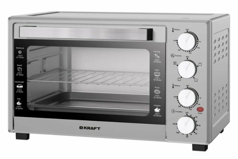 Мини-печь KRAFT объёмом 38 литров. Мини-печь работает в 4 автоматических режимах, с помощью которых можно приготовить и разогреть разнообразные блюда. Мощность 1600 Вт обеспечивает быстрый нагрев. Максимальная температура нагрева 250 C и хорошая теплоизоляция подходит для выпечки хлеба, мясных и рыбных блюд. Функция конвекции обеспечивает равномерное распределение горячего воздуха внутри камеры. Поворотные переключатели способствуют быстрому выбору и легкой установке параметров готовки. Благодаря дверце из закаленного стекла вы с легкостью сможете контролировать приготовление блюда. Таймер со звуковым сигналом уведомляет о завершении процесса.