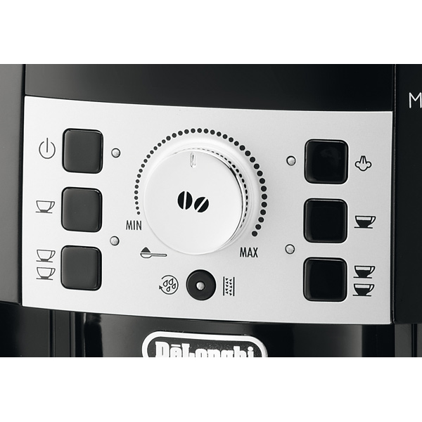 Кофемашина DeLonghi ECAM 22.114 B Magnifica S оборудована новой кнопочной панелью управления. Вращением регулятора вы можете изменить крепость кофе. А нажатие кнопки позволяет выбрать порцию необходимого объема. Температуру воды или жесткость по своему предпочтению можно запрограммировать в этой модели кофемашины. Мощность прибора 1450 Вт. Давление, которое создается в системе, составляет 15 бар, это идеальное значение для качественной экстракции кофейного порошка.