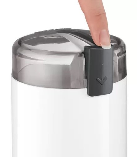 Кофемолка с ножами из нержавеющей стали, резервуаром для зерен вместимостью до 75 гр., прозрачной крышкой для контроля степени помола и системой блокировки работы при незакрытой крышке.