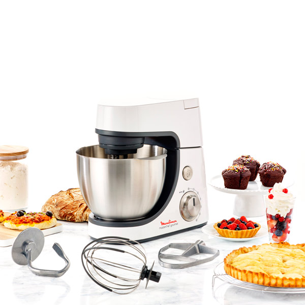 С помощью устройства можно не только приготовить крем или смешать продукты, но и замесить густое тесто. Оно снабжено мощным мотором и поставляется в комплекте со специальными крюками. При этом пользователю доступно шесть скоростных режимов, подходящих для выполнения разных задач.