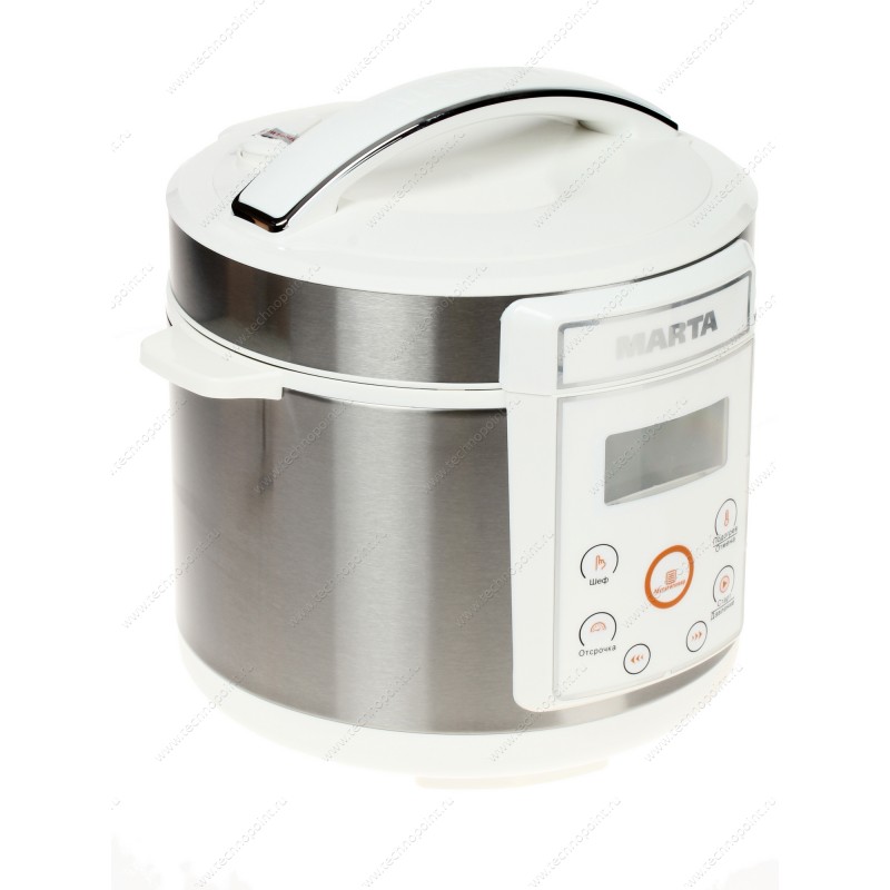 Мультиварка Marta MT-1968 выполнена в корпусе из высококачественной нержавеющей стали. Теперь весь процесс готовки заключается в правильном выборе программы (35 автоматических программ приготовления) и закладке продуктов. Два слоя антипригарного покрытия повышают устойчивость внутренней поверхности пятилитровой чаши к механическим воздействиям и высоким температурам. Режим готовки под высоким давлением (скороварка) уменьшит время приготовления, а вся информация об этапах выбранной программы отражается на сенсорной панели управления. С помощью режима «Мультиповар» можно установить свое, оптимальное время, которое потребуется для приготовления кулинарного шедевра. «Отсрочка старта», «Программа подогрева» — стандартные опции, с помощью которых блюдо приготовится точно в срок, без вашего контроля и будет оставаться теплым в течение 24 часов.