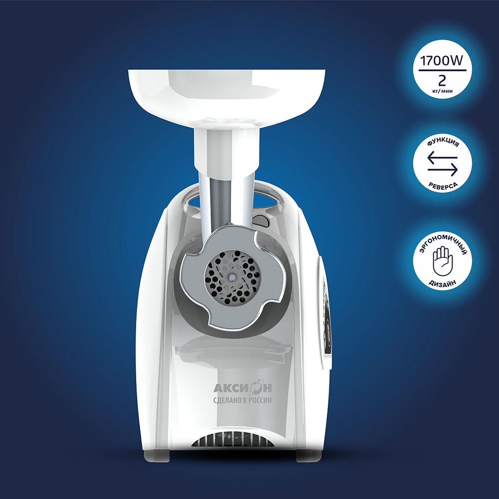 Электрические мясорубки линейки М42 «Аксион» обладают мощностью  1700 Вт и обеспечивают переработку до 2 кг продуктов в минуту. Особенность модели – электронное управление с индикатором уровня нагрузки, которое защитит мясорубку от перегрева и обеспечит высокую надежность ее работы.
