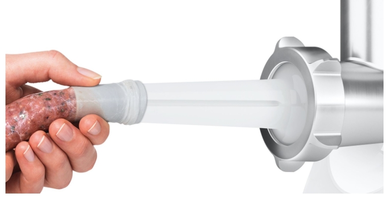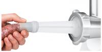 Небольшая, но мощная электрическая мясорубка от популярного немецкого производителя бытовой техники — компании Bosch. Это достаточно многофункциональная модель среднего ценового диапазона, которая может послужить отличным выбором для бытовой эксплуатации. Пиковая мощность работы составляет 2000 Вт, при этом аппарат всего за одну минуту позволяет производить до 2,5 кг фарша. Производитель оснастил прибор целым набором насадок: в комплекте идут 3 перфорированных диска для фарша (с крупными, мелкими и средними отверстиями), насадка для кеббе и для домашних колбас. Таким образом, с помощью этого аппарата вы можете приготовить широкий спектр мясных и фаршированных блюд. Мясорубка Bosch MFW 3X10W оснащена функцией реверса, которая поворачивает шнек в обратном направлении и помогает таким образом извлекать непереработанное мясо. Защита от перегрузок автоматически отключается прибор в случае критического возрастания нагрузки — если, к примеру, в шенк попадет кость. Корпус оснащен отсеком для хранения насадок и шнура, благодаря чему прибор занимает минимальное место на кухне, сами насадки не теряются, а шнур не путается под руками.