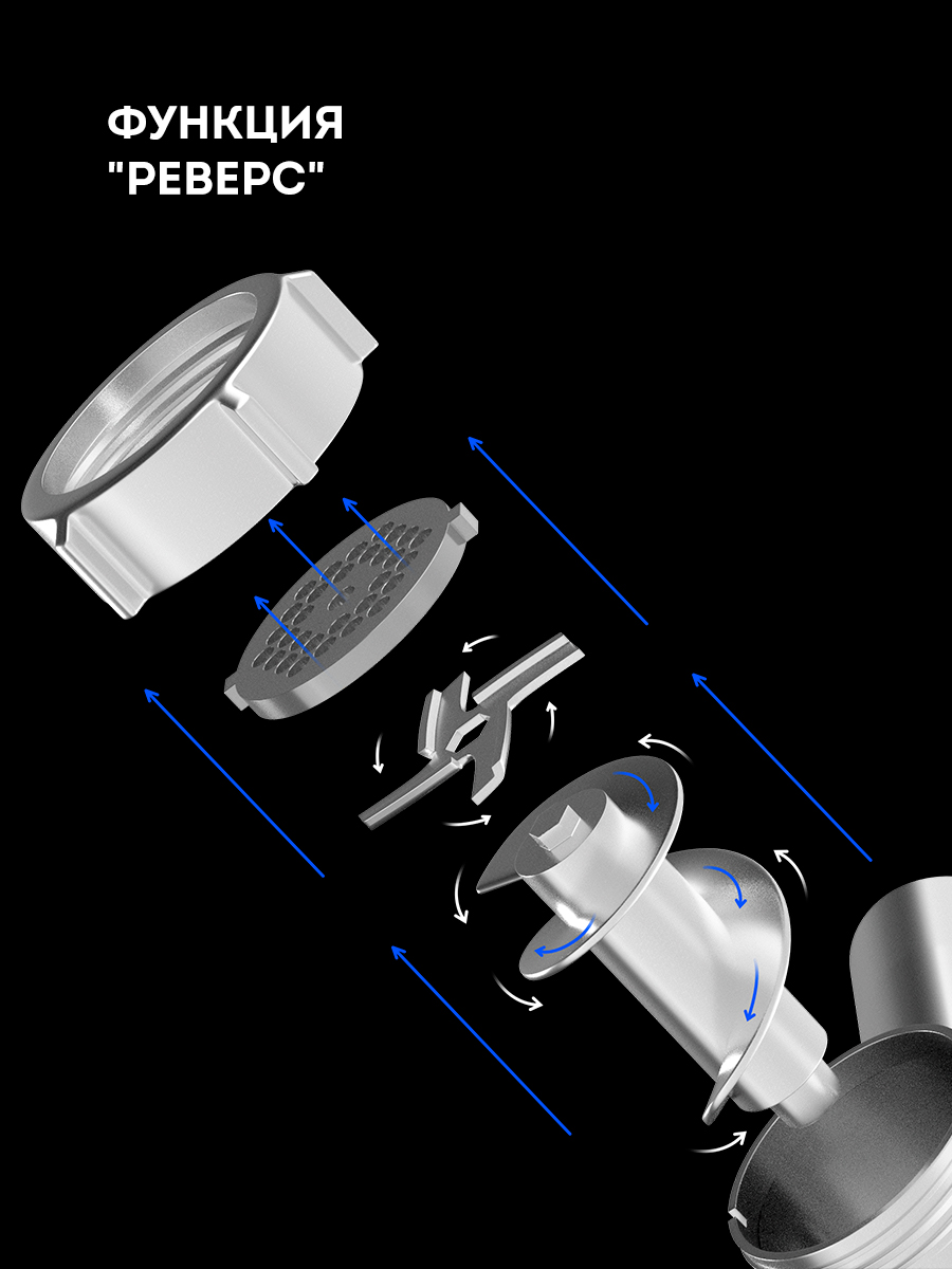 Функция «Реверс» позволяет проворачивать шнек мясорубки в обратном направлении.
