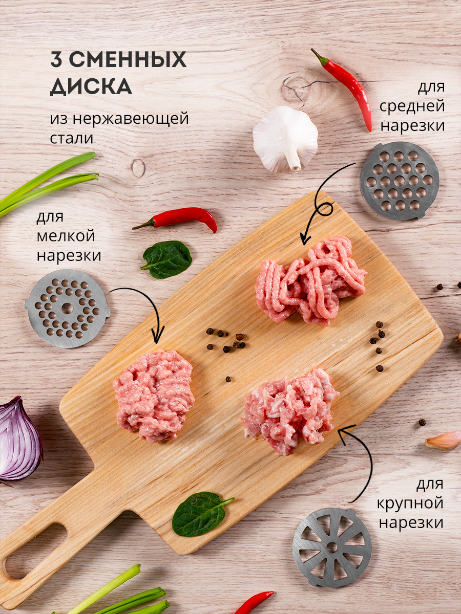 Диски мелкой, средней и крупной нарезки, а также дополнительные насадки для приготовления сосисок и «кеббе» позволят выбрать необходимую степень измельчения продуктов в соответствии с рецептом.