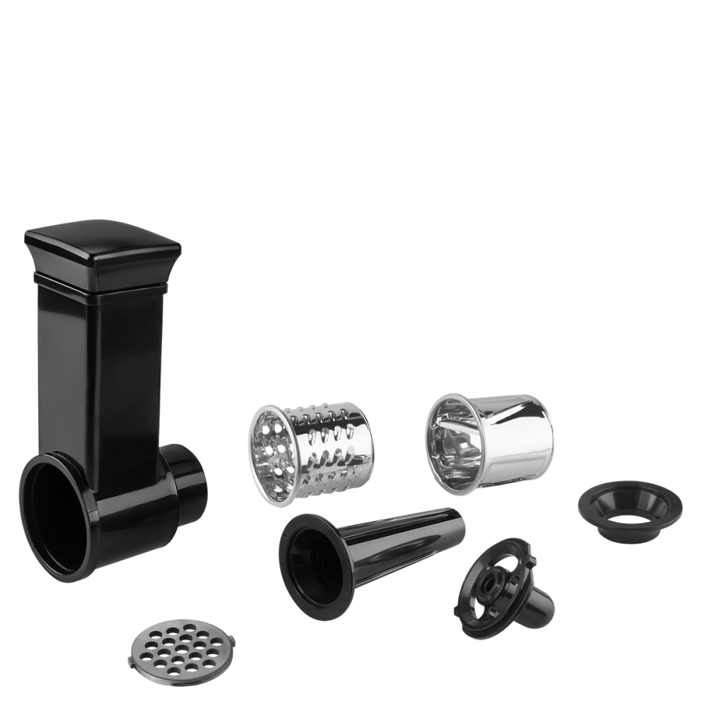 В комплекте 6 насадок: 2 перфорированные решетки с отверстиями 5 и 7 мм, насадки для кеббе и для приготовления домашней колбасы, овощерезка с крупной теркой и шинковка.