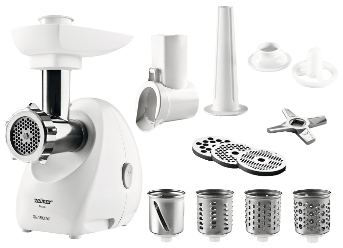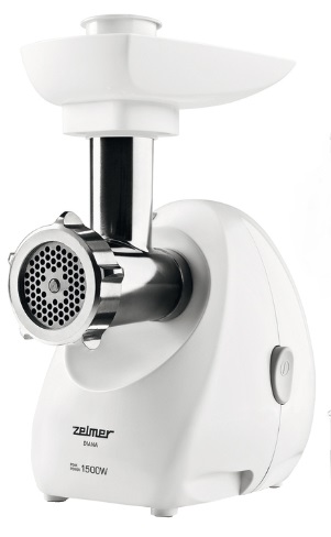 ZELMER ZMM 1094SRU - мясорубка мощностью 1500 Вт в корпусе из гигиеничного пластика. Оснащена отсеком для шнура, прорезиненными ножками и пластиковым лотком загрузки продукта. В комплекте 3 перфорированных диска для фарша различной консистенции, насадкой-овощерезкой и теркой. Также предусмотрена насадка для колбас и кеббе.