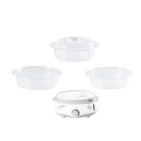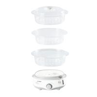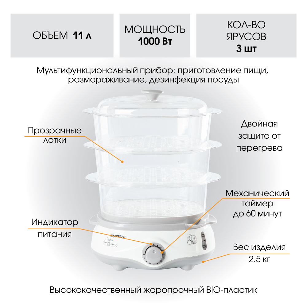 Индикатор питания, Механический таймер до 60 минут, Двойная защита от перегрева, Мульти-функциональный прибор: приготовление пищи, размораживание, дезинфекция посуды, Прозрачные лотки - удобно следить за готовностью блюда, Чашу и другие пластиковые части допускается мыть в посудомоечной машине