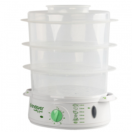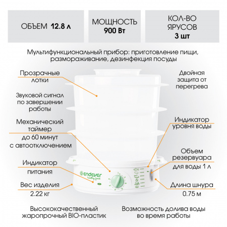 Индикатор питания, Индикатор уровня воды, Высококачественный жаропрочный BIO-пластик, Возможность долива воды во время работы, Механический таймер до 60 минут с автоотключением, Звуковой сигнал по завершении работы, Двойная защита от перегрева, Мультифункциональный прибор: приготовление пищи, размораживание, дезинфекция посуды, Прозрачные лотки - удобно следить за готовностью блюда, Лотки и другие пластиковые части допускается мыть в посудомоечной машине