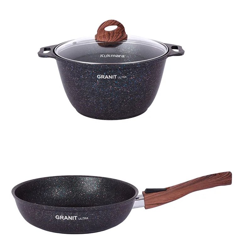 Набор посуды Kukmara станет прекрасным подарком на любое торжество и оставит приятные воспоминания на долгие годы. В состав набора посуды линии Granit ultra входят кастрюля 4 л со стеклянной крышкой и сковорода 24 см со съемной ручкой - идеальный тандем для успеха на кулинарном поприще! Стеклянная крышка подходит и для кастрюли, и для сковороды. Посуда имеет отличные теплораспределительные и теплоаккумулирующие свойства, и блюда в ней получаются сочными и ароматными.