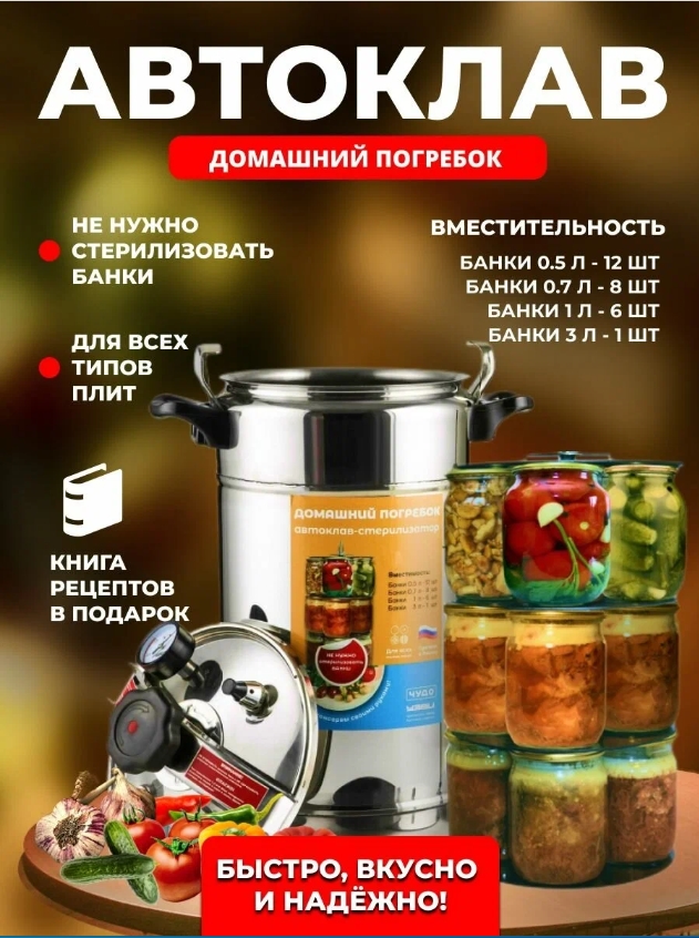 Автоклав "Домашний Погребок" - это универсальный аппарат для консервирования продуктов из своих ингредиентов и по своим собственным рецептам. Он позволяет быстро и легко приготовить вкусные домашние консервы из мяса, рыбы и овощей.