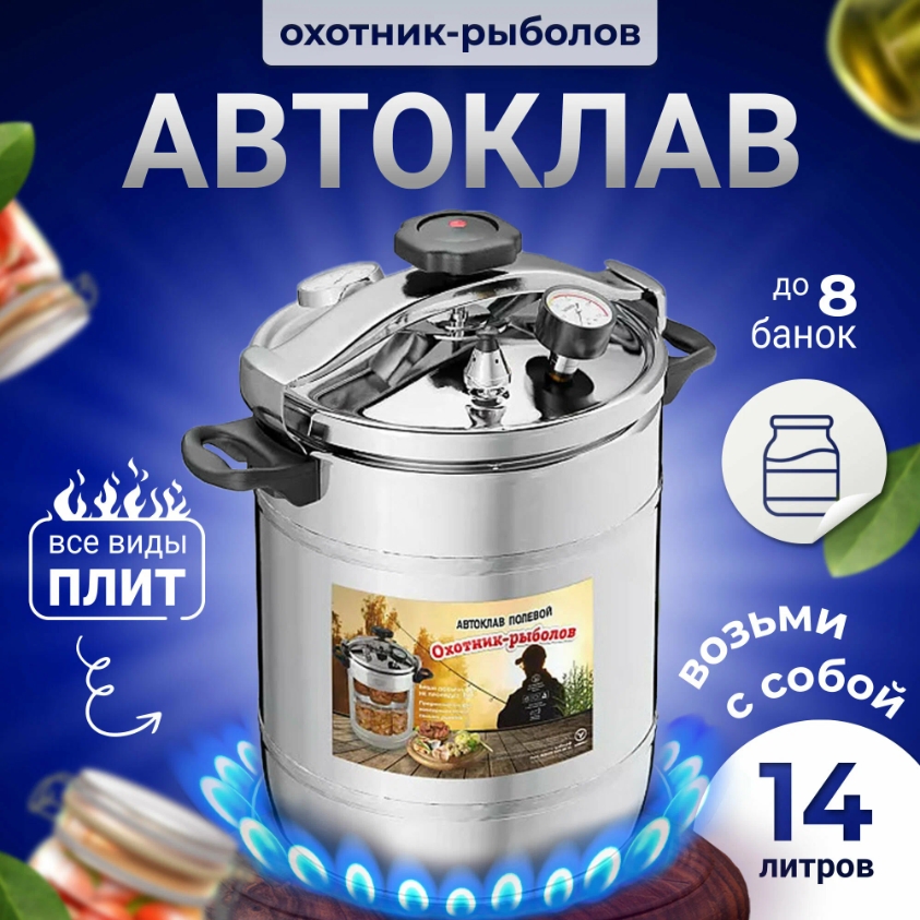 Название: Автоклав из нержавеющей стали "Охотник-Рыболов" на 14 литров - это надежный и удобный прибор для приготовления мясных и рыбных консервов. Он изготовлен из пищевой нержавеющей стали, толщина которой составляет 1,2 миллиметра на дне и 4 миллиметра на стенках. Подходит для всех типов плит, включая индукционные, а также оснащен огнеупорными ручками и прочным корпусом для безопасной эксплуатации.