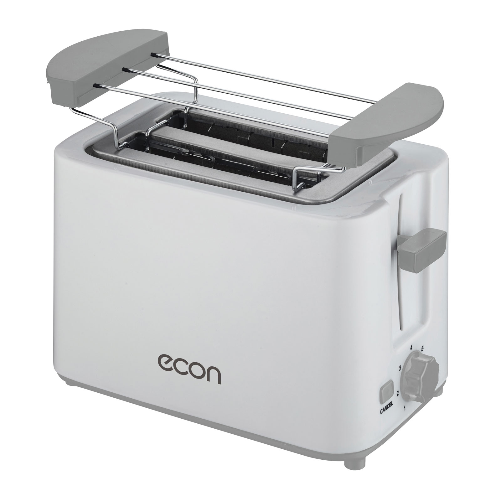 Компактный тостер для одновременного обжаривания двух ломтиков хлеба с регулятором степени обжаривания, поддоном для крошек, отсеком для шнура и решеткой для подогрева булочек.