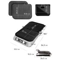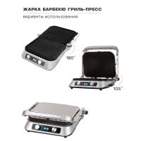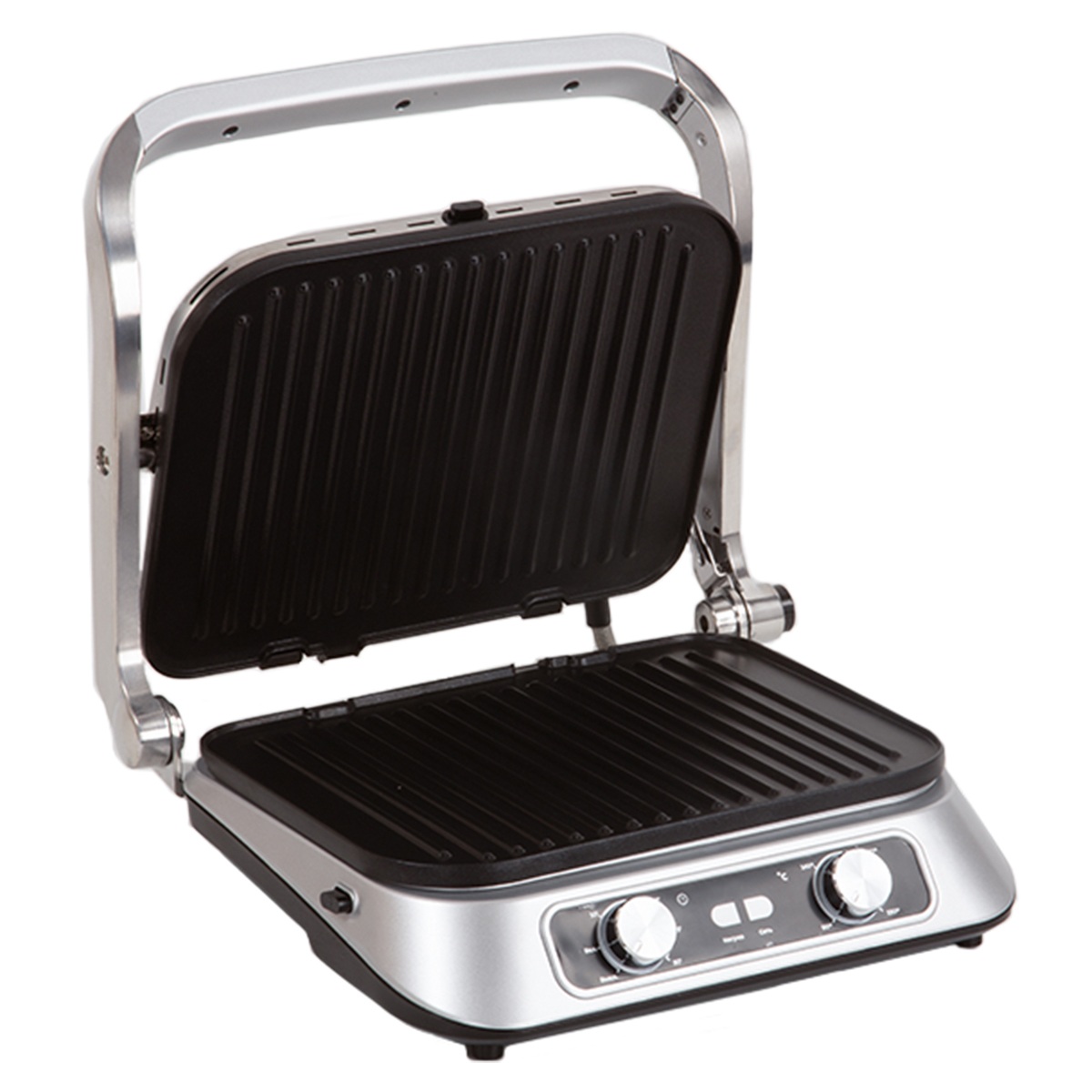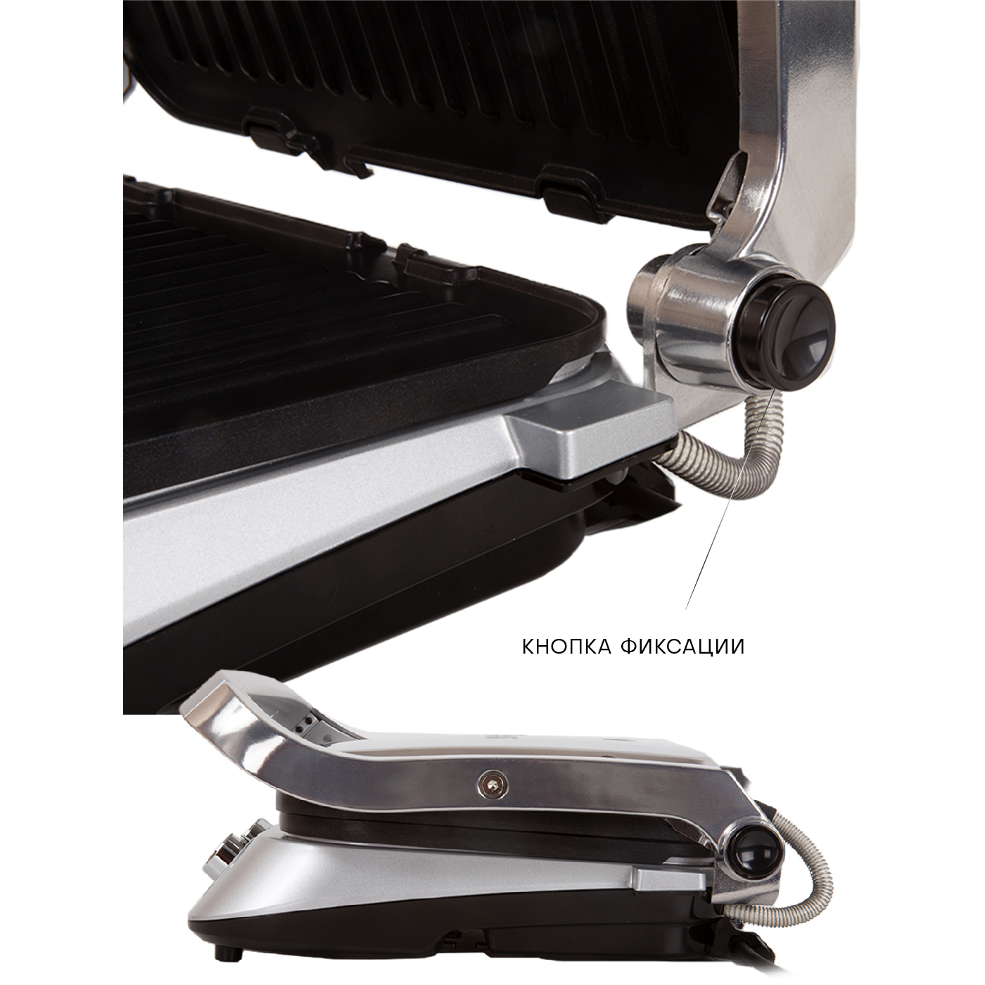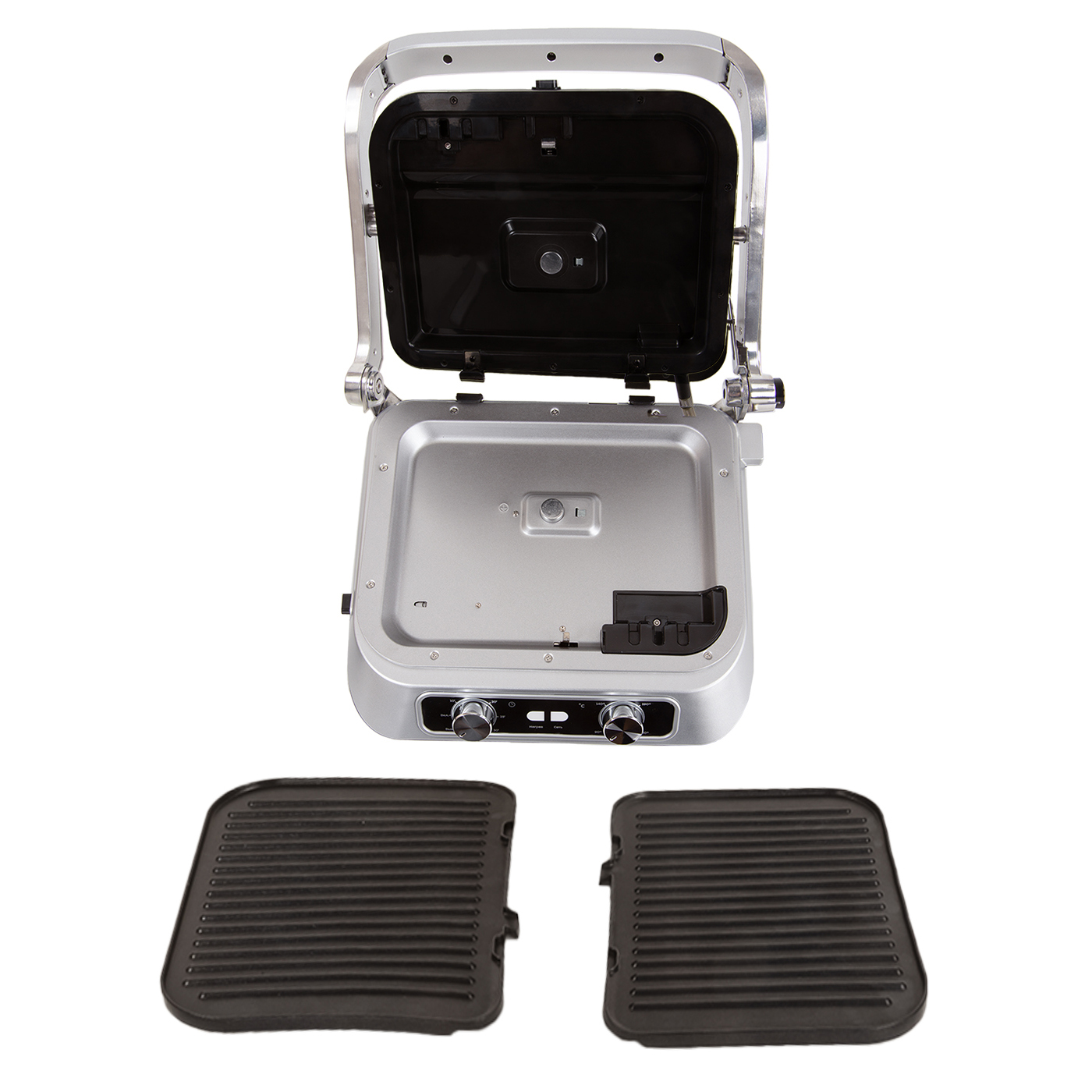 В зависимости от своих задач и предпочтений, вы можете готовить блюда на гриле под крышкой и в открытом режиме, когда обе панели, верхняя и нижняя, раскрываются в одной плоскости, как одна большая жарочная поверхность.