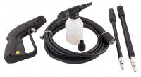 Комплектация: пистолет-распылитель, удлинитель пистолета с соплом, гибкий шланг высокого давления, емкость для моющих средств, переходник, игла для очистки сопла.