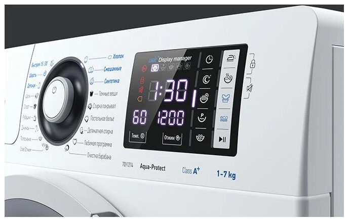 выбор температуры стирки, выбор скорости отжима, контроль за уровнем пены, сигнал окончания стирки, отложенный старт, контроль баланса
