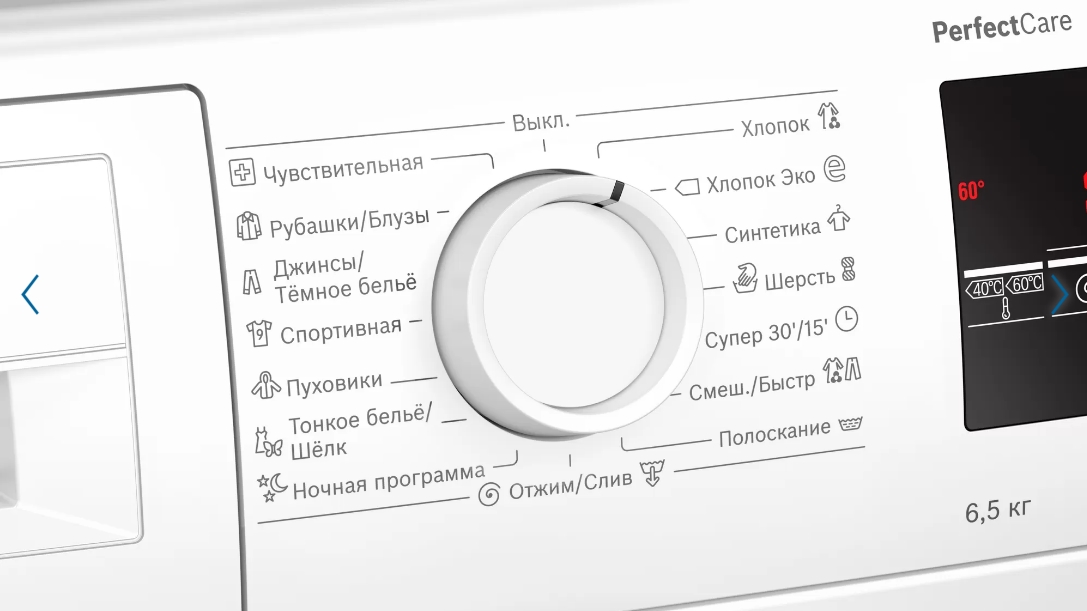 Программы стирки: Хлопок, Хлопок Эко, Синтетика, Шерсть, Супер 30/15, Смеш/Быстр., Ночная программа, Тонкое бельё/Шёлк, Пуховики, Спортивная, Джинсы/Тёмное бельё, Рубашки/Блузы, Чувствительная, Полоскание, Отжим/Слив