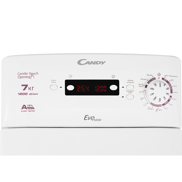 Стиральная машина с вертикальной загрузкой Candy EVOGT 12072D/1-07 оснащена цифровым дисплеем, который облегчает настройку устройства перед запуском, а также может отображать время, оставшееся до конца программы.