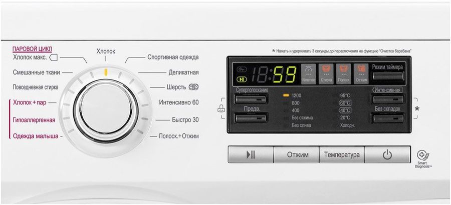 Программы Хлопок, Хлопок макс., Повседневная, Смешанные ткани, Спортивная одежда, Быстро 30, Деликатная, Интенсивно 60, Шерсть, Одежда малыша, Полоскание+Отжим, Хлопок + пар, Гипоаллергенная