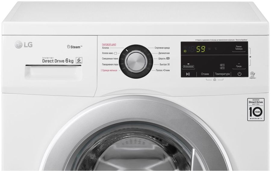 LG F2J3NS1W имеет электронное управление, и все настройки отображаются на небольшом дисплее. В стиральную машину уже заложены 10 программ: для хлопка, смешанных тканей, шерсти, спортивной и детской одежды и другие. За один цикл она расходует 56 литров воды и потребляет небольшое количество энергии.