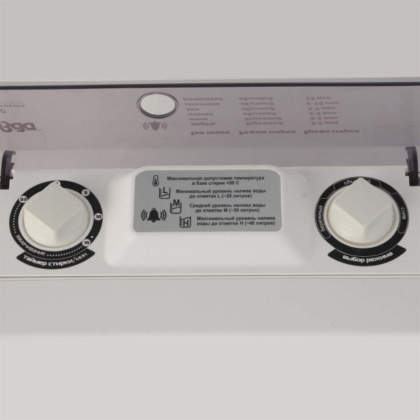 Контрольные элементы вынесены на верхнюю часть корпуса. Они представлены в виде пары поворотных переключателей: таймера и установщика режимов. Всего предусмотрено две программы: «Обычная» и «Бережная», специально разработанная для таких деликатных тканей, как натуральный шёлк и шерсть. Об окончании цикла вовремя сообщит чёткий звуковой сигнал.