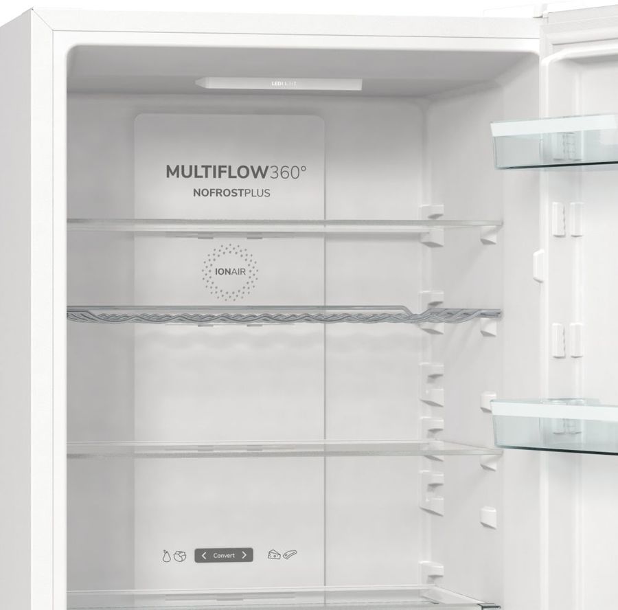 Ионизатор IonAir создает внутри прибора отрицательно заряженные ионы, которые равномерно распределяются по всему холодильному отделению с помощью новой системы вентиляции MultiFlow 360°. Воздух, обогащенный анионами, сохраняет вкус продуктов и удаляет неприятные запахи.