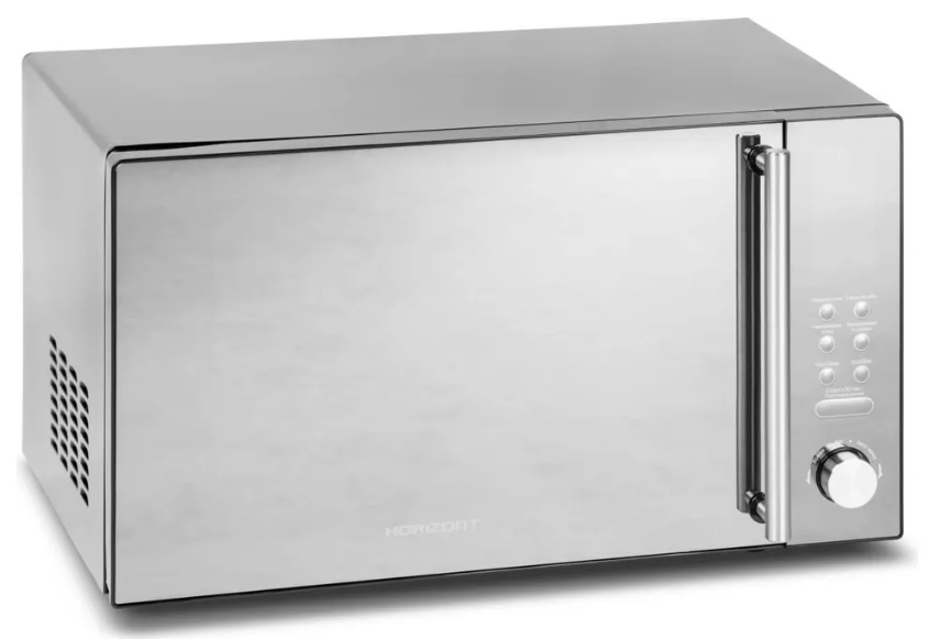Микроволновая печь Horizont 25MW900-1479DKB серебристо-серого цвета обладает стильным дизайном и хорошей функциональностью. Кроме того, микроволновка очень вместительная (объем 25 л), что позволяет с удобством использовать ее в большой семье или рабочем коллективе. На стеклянный поддон диаметром 31.5 см может поместиться одна большая чашка или несколько маленьких. Поэтому удобно будет разогревать или готовить блюда в больших объемах. Есть режим гриля, для чего микроволновая печь оборудована решеткой.У микроволновой печи Horizont 25MW900-1479DKB предусмотрены 4 автопрограммы приготовления, включая режим разогрева и размораживания. Для удобной настройки и контроля всех функций микроволновка оснащена дисплеем, панелью с кнопками и поворотным переключателем. Таймер можно устанавливать максимум на 95 минут. Также имеется функция отсрочки старта и внутренняя подсветка. Покрытие из нержавеющей стали внутренней камеры делает уход за микроволновой печью довольно простым и удобным.