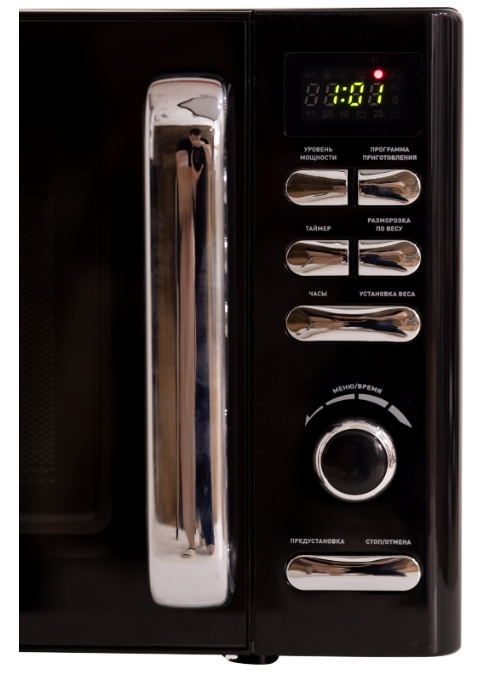 Данные микроволновые печи оснащены электронной панелью управления с интуитивно понятными символьными подсказками. Это позволяет сразу выбрать подходящие настройки в зависимости от задачи. На дисплей выводится информация об уровне мощности, оставшихся минутах до завершения программы и текущее время. С помощью кнопки «Стоп/Отмена» удобно приостанавливать или прерывать выбранный режим. Нижний переключатель предназначен для установки таймера, максимальное значение которого составляет 30 минут.