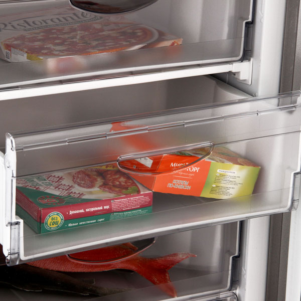 В морозильной камере размещается шесть цельнолитых ящиков из пластика. Прочные ящики легко выдерживают вес продуктов, они оснащены удобными ручками, с помощью которых их можно удобно выдвигать и задвигать обратно.